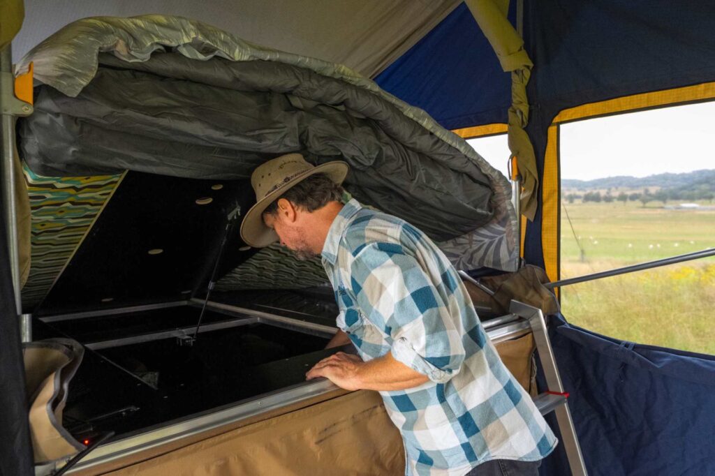 Apart from opening the rear door where the kitchen is, you can also get into the trailer through the side access that can be opened with the tent closed or fully set up.