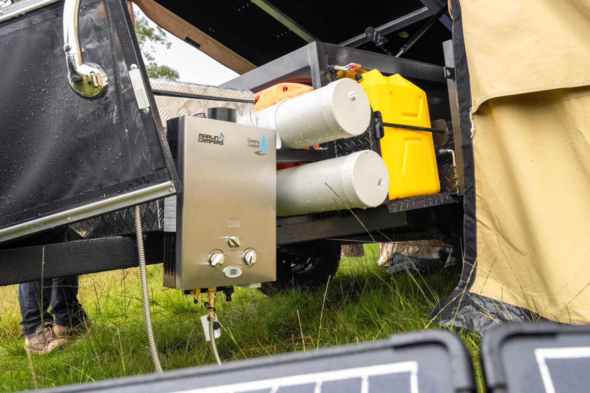 - Apart from opening the rear door where the kitchen is, you can also get into the trailer through the side access that can be opened with the tent closed or fully set up.
